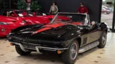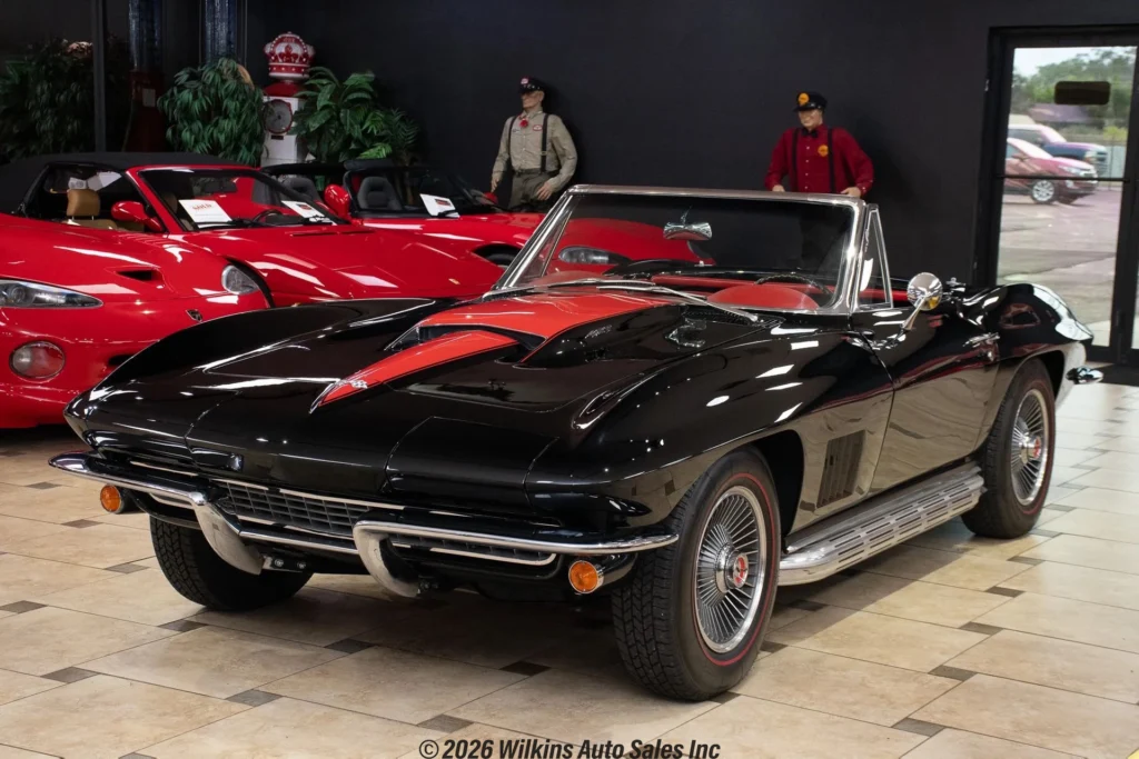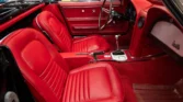 Offering a stunning 427 C.I. Big Block V8 featuring correct Winters aluminum heads and intake, L88 high-flow air cleaner, and Muncie 4-speed manual transmission. It includes side exit exhaust, 4-wheel disc brakes, power brakes, 6,500rpm redline tachometer, and 4.11 posi rear differential. Finished in Tuxedo Black with red stinger stripe, red vinyl interior, black convertible top, and shimmering chrome accents. Contact us for details!