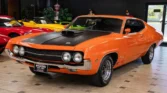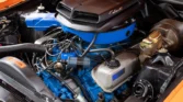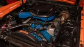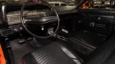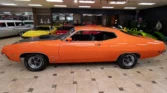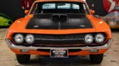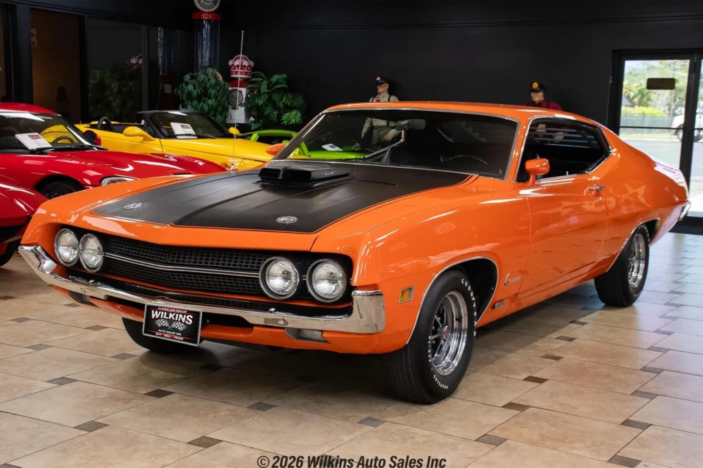 True J-Code Ram Air car featuring a 429 C.I. Super Cobra Jet V8 with shaker ram air intake and close-ratio 4-speed manual transmission. It includes power steering and brakes, disc brakes, hood pins, rear window louvers, and factory Turin black bucket seats. Finished in stunning Calypso Coral paint. Contact us today for details!