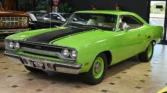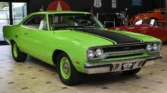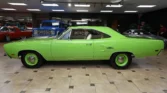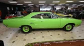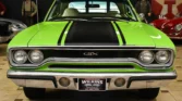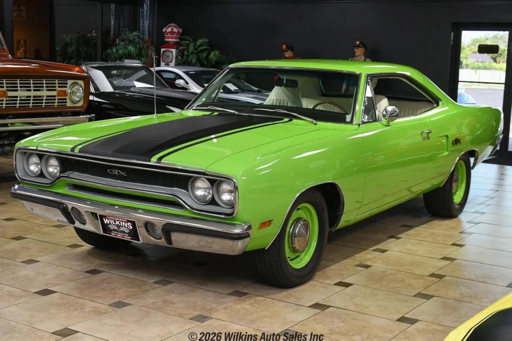 Offering a powerful Big Block 440 C.I. 6-barrel V8 muscle car with heavy-duty 4-speed manual transmission and Hurst pistol grip shifter. Features include power steering and brakes, upgraded aluminum radiator with dual electric fans, modern A/C, wood-rim steering wheel, Mopar performance valve covers, white vinyl interior with front bucket seats and center console, and classic painted steel wheels with “dog dish” hubcaps. Finished in striking FJ5 Limelight. Contact us for details!